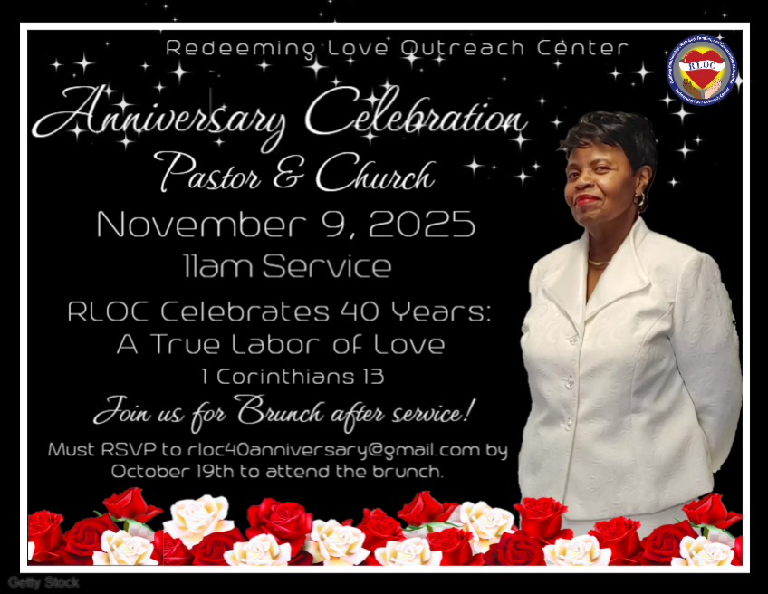 established our church now known as Redeeming Love Outreach Center. We will be hosting a special service with lots of great music and a brunch immediately following at the church in the Upper Room. If you would like to stay for brunch please RSVP to rloc40anniversary@gmail.com