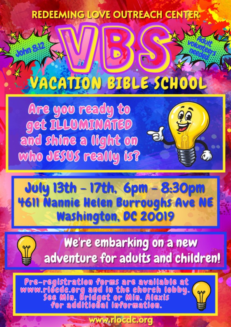 This summer RLOC is launching Vacation Bible School from July 13th – July 17th. We are embarking on a new adventure for adults and children and are soliciting adult volunteers to assist with classes and activities. Pre-registration for both adults and children is required by April 26th. Register at the link below or get a form on the table in the church lobby
